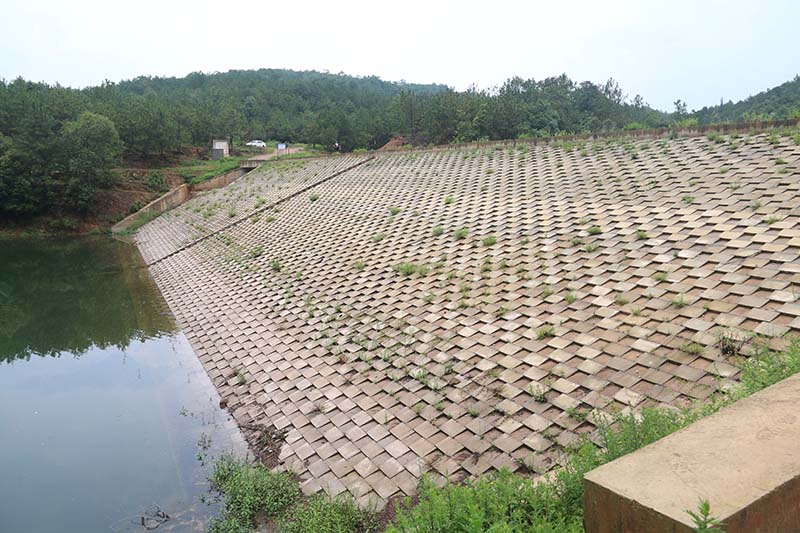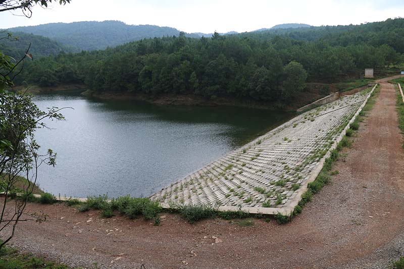建設規(guī)模( ㎡ ):水庫總庫容36.22萬m3,為小(2)型水庫,工程等別為V等,建筑物級別為5級,地震設防烈度為8度。壩頂按2027.00m恢復,壩頂寬4.0m,在上、下游設30cm寬的C15砼路緣石,路緣石頂高程為2027.20m。上游壩坡按1:2.3、1:3.25整形,采用砼預制塊護坡;下游壩坡2018.00m以上按1:2.3整形填補,在2018.00m設2m戧臺,戧臺以下用風化料培厚為1:2.5,坡腳設排水棱體,采用植草護坡。對大壩采用鉆孔灌漿進行垂直防滲處理。涵洞內(nèi)襯砌DN400mm鋼管,涵洞與涵管間沖洗干凈,用水泥漿充填。拆除進口轉(zhuǎn)蓋閘(包括涵臥管),增設豎井式取水口,增設檢修閘、工作閘個一套,均為DN400mm蝶閥,并建閘門房,下游設泄槽及消力池。加固順流左岸已建溢洪道。新建水庫管理房50m2,并增設大壩觀測設施。